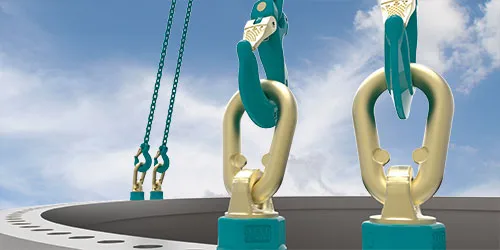 Due to the constant increase in the size and weight of the tower segments, KDG has developed a wide range of counter retention plate systems. In combination with the KDG ENORM lifting equipment grade 10 and the special Theipa Point ballbearing-mounted attachment swivels, a load capacity of up to 100t can be guaranteed during assembly.